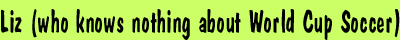 Even though the scoring is so simple that you could do it yourself, the Contest Staff at Laughton.org will compute the scores for everyone. Feel free to check our work. We'll add up the goals scored by all the World Cup teams and then compute the difference between the left and right columns for each player. At the end of the tournament, the winner will be the player with the smallest difference between the goals scored by each of his groups. Look for results to be posted on this page frequently during the competition.